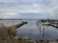 Die Badestelle befindet sich etwas außerhalb des Ortes. Es gibt dort auch einen niedlichen Hafen und eine Anlegestelle. Blickt man von hier nach Nordwesten kann man gut den westlichen Teil der Autbahnbrücke sehen. Man merkt dabei gar nicht das dazwischen noch die Landenge zwischen Bogø und Fanø liegt.