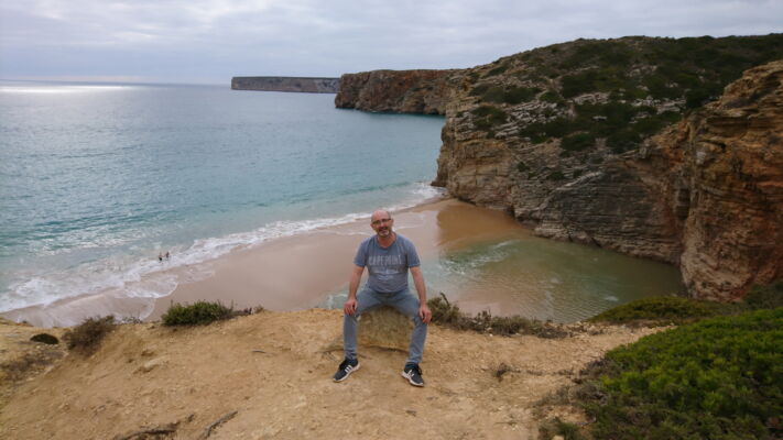 Nach einer Stärkung am Hafen von Sagres gings dann hinüber zum südwestlichsten Punkt Portugals. Auf dem Weg dorthin machten wir noch einen Zwischenstop am Praia do Beliche. Aber nicht um zu Baden, sondern um den schön gelegenen Geocache Beliche Beach View (GC3HY9A) zu suchen. Er liegt auf der östlichen Landspitze vor dem Strand. Man hat einen herrlichen Ausblick!