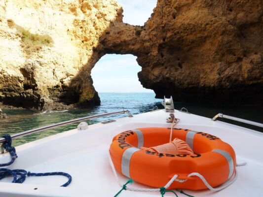 Ausflugs-Tipp: Auch wenn die Höhlen von Benagil die größere Attraktion an der Algarve sind, lohnt sich eine spontane Bootsfahrt zur Landspitze am Leuchtturm. Zwisch den zahlreichen Kajakfahrern ist man von Lagos ziemlich schnell vor Ort und die kleinen Motorboote für ca. 8 Personen sind klein und wenig genug, um auch die verstecktesten Ecken anzusteuern. Gerade wenn für Benagil der Seegang zu stark ist, wird diese Tour zum Abenteuer: Es gibt viele Höhlen und Felsdurchfahrten, bei denen der Bootsführer genau das richtige Timing braucht, um nicht gegen die Felsen zu schlagen. Und bei all diesem Auf und Ab zwischen den bis zu 3m hohen Wellen hat er meist noch einen lustigen Spruch auf Lager. Die ca. einstündigen Fahrten starten an der Marina de Lagos – direkt am alten Bahnhof, der mittlerweile ein Lost Place ist.