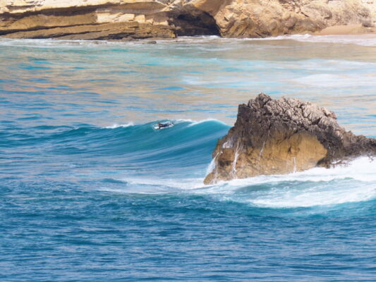 Wir schulterten die Ikea-Tüte mit den Badesachen und machten uns auf den Weg Richtung Strand. Nach ca. 30 Metern erreichten wir ein großes Loch, welches mit einer kleinen Mauer gesichert war. Ein paar Meter weiter ging es 60m schnurgerade in die Tiefe. Die Brandung war deutlich zu hören doch damit hatten wir nicht gerechnet! Nun suchten wir nach einem Weg nach unten und fanden einen steilen Pfad, der eigentlich nicht für Badeschlappen ausgelegt war. Wir kletterten vorsichtig nach unten und erreichten den Weg, der zum vorgesehenen Parkplatz führt. Doch damit hatten wir erst die Hälfte geschafft. Ein paar Treppen brachten uns dem Ziel deutlich näher… doch am Ende mussten wir an einem Seil nach unten Klettern. Ein paar Jugendliche kamen uns entgegen und überliesen uns den gesamten Strand mit der Meerjungfrau, die sie gerade aus Sand gebaut hatten. Es war irgendwie surreal… Die Sonne stand schon ziemlich tief und die Felsen legten einen riesigen Schatten über die Bucht. Die Brandung war so stark, das man überhaupt nicht ins Wasser gehen konnte. Im Vordergrund der freistehende Felsen mitten im Wasser und links die bedrohlich anziehende Höhle. Ich versuchte, einen Blick hinein zu werfen, doch ich kam nicht weit genug ran und die Wellen waren zu hoch, um hinein zu schwimmen. Wir genossen noch eine ganze Weile die Einsamkeit an diesem beeindruckendem Ort bevor wir die Steilküste wieder hinauf klettern mussten. Erst jetzt beim Schreiben dieser Zeilen wurde mir klar, das die Löcher oben auf dem Plateau Durchbrüche zu der riesigen Höhle waren.