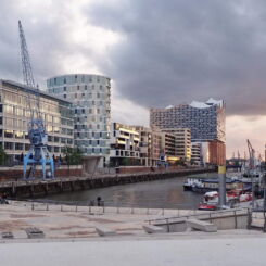 Über die Magellan Terrassen gings für uns weiter zur Elphi. Dort bietet sich auch ein Besuch der Aussichtsterrasse an. Wir bestaunten kurz den Sonnenuntergang zwischen den Kränen des Trockendock 17 am alten Elbtunnel und gingen hinüber zur Kehrwiederspitze. Hier gibts die alte Polizeiwache und die Flussschifferkirche. Für ein Panorama der Speicherstadtfrontalen zwischen Miniaturwunderland, Zollmuseum und Wandrahmsteg-Brücke wählten wir den Weg vorbei am Neuen Kran und der Katharinenkirche nördlich der Speicherstadt.