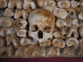 Dreht man sich jetzt wieder Richtung Kirche sieht man die eigentliche Knochenkapelle. Sie ist aus den Gebeinen von mehr als 1000 Mönchen des Karmeliterorden gebaut und 1816 eingeweiht worden (Quelle: Wikipedia).
