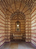 Doch wenn man bis zum Altar geht und dann rechts durch die Tür abbiegt, findet man sich in sehr edlen Räumlichkeiten wieder. Und wenn man sich auch davon nicht ablenken lässt, gelankt man zu einer einfachen Holztür mit der Aufschrift Capela dos Ossos. Dahinter befindet sich der Klostergarten. Der Blick fällt sofort auf einen kleinen Altar im hinteren Teil des Gartens. Kommt man näher, sieht man die Vertiefungen im Mauerwerk… sie stammen von menschlichen Gebeinen. Durch die Witterung oder andere Einflüsse sind jedoch kaum noch Knochen vorhanden.