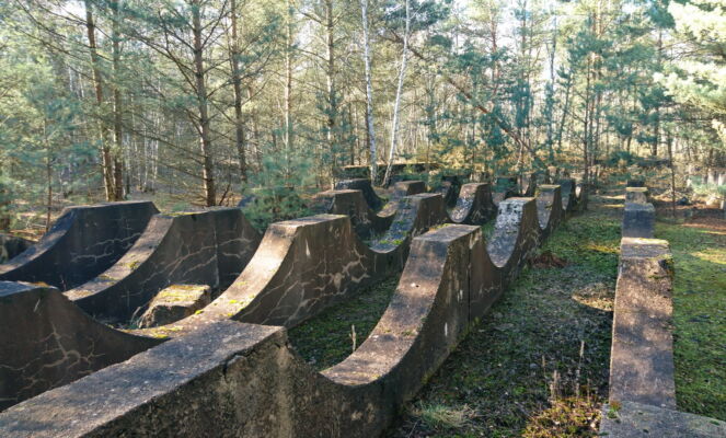 Östlich des Industriegebietes findet man die Überreste der alten Sprengstoff-Fabrik im Wald. Überall befinden sich kolossale Betonelemente und gesprengte Bunker. Hier sollte man jedoch immer mit Wildschweinen rechnen.