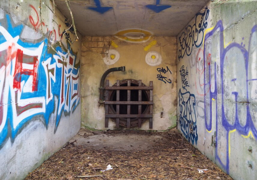Wir brauchten eine ganze Weile, um den richtigen Eingang zu finden. Ohne GPS Koordinaten hätten wir ihn wohl nie gefunden. Auch diese Tanks haben am höchsten Punkt ein Belüftungssystem. Es ist allerdings etwas filigraner als das von den großen Doppeltanks. Der Eingang führt hier durch eine Art Tunnel. Der Eingang besteht aus einer Tür in der Böschung. Dahinter folgt ein kleiner Gang mit einem Treppenhaus. Im unteren Teil befinden sich einige Rohre – sie sind aber nicht mehr angeschlossen. Von dort führt eine kleine Stahlleiter hinab zum Tankanschlussraum. Die Öffnung besteht aus einem Stahlrohr mit ca. 50cm Durchmesser. Es ist ungefähr 1,5m lang – da muss man durch, wenn man den Tank von innen bestaunen möchte!