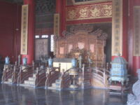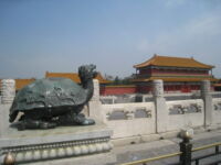 Die Verbotene Stadt selbst haben wir uns im Rahmen einer großen Sightseeingtour natürlich auch angesehen. Wir fuhren mit der U-Bahn bis zum Tiananmen Platz. Dafür mussten wir einmal umsteigen – alles klappte. Und das für 2 RMB! Der Platz des Himmlischen Friedens hat außer vielen Leuten, riesigen Videoleinwänden und dem Mao Mausoleum nicht viel zu bieten. Aber wir wollten einfach mal dort gewesen sein. Danach gings zur Verbotenen Stadt – wir nahmen einen Seiteneingang, der uns durch einen schönen Park voller alter Zypressen zum Haupteingang führte. Unterwegs zeigte uns noch eine Künstlerin ihre Kalligrafien. Für eine kleine Spende zeichnete sie uns persönliche Wünsche für ein langes und glückliches Leben. Ich werde mir die Zeichen wohl mal von einem Chinesen erklären und vorlesen lassen.