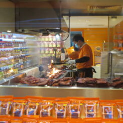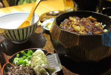 (unten links): ein japanischer Sterne Imbiss der nur gegrillten Aal anbietet. Es gibt eine handvoll Kombinationen mit Suppe, Reis und Wasabi zum Selberreiben.