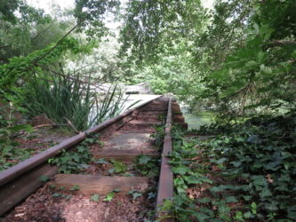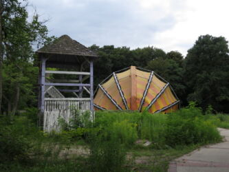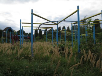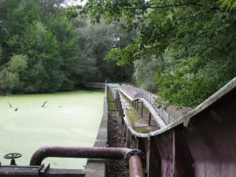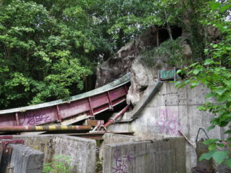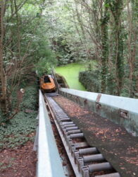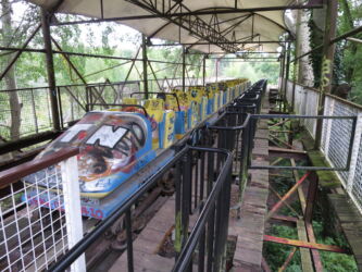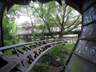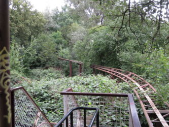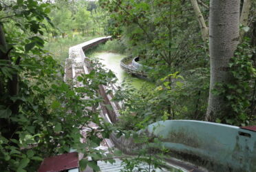 Besucht man den Bahnhof der Achterbahn hat man das Gefühl, die nächste Runde startet in wenigen Minuten: Der Zug steht abfahrbereit zwischen den mittlerweile entfernten Bahnsteigen. Ein beindruckendes Bild erhält man, wenn man sich in den ersten Wagen setzt und die Strecke verfolgt bis sie nach ca. 50m im Urwald verschwindet. Hier hat sich die Natur schon einiges zurück geholt. Noch abenteuerlicher gestaltet sich die Szenerie an der alten Wildwasserbahn… Man fühlt sich wie bei Idiana Jones: Eine alte Bahnstrecke führt über einen See voller Entengrütze – iregndwie befremdlich. Und dann steht man vor dem Turm der Wasser-Rutsche. Die Technik völlig verrottet und das Innenleben des Turm schreit nach Einsturz! Das stört jedoch die Graureiher nicht, die sich hier sehr wohl fühlen.