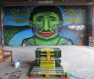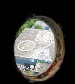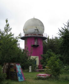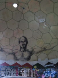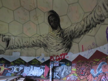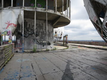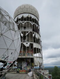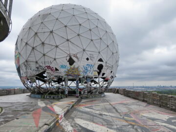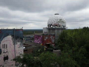 Dafür muß man dann doch zum großen Turm. Von hier aus kann man wunderbar das gesamte Gelände mit all seinen Antennenkuppeln bewundern. Hat man das Dach der großen Halle erreicht, kann man am Fuße des Turmes zwei Kuppeln betreten. Sie bestehen aus einem Gerüst aus Metallprofilen, die mit einer Art LKW Plane bezogen sind. Von hier aus hat man auch einen schönen Ausblick – auf der einen Seite Berlin – auf der anderen Wald, soweit das Auge reicht. Selbst hier oben ist alles mit Graffities verziert. Hier startet auch die letzte Etappe… Über das dunkle Treppenhaus, was über mehrere Runden den stillgelegten Aufzug umrundet, gehts ganz nach Oben in die große Kuppel. Sie besteht aus einem festen Material und ist vollständig erhalten. Nur eine Tür und ein kleines Loch bieten die Möglichkeit, nach draußen zu sehen. Die Akkustik ist der Wahnsinn! Das Innere der Kuppel ist ebenfalls mit einem Kunstwerk versehen – allerdings viel größer und beeindruckender als alle anderen. Man fragt sich unweigerlich: Wie kann man das hinbekommen? Hier oben endet dann auch die Spur der kleinen Katzen.