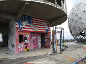 Man merkt sehr schnell, was das hier einmal war – STRENG GEHEIM – auch die NSA war hier tätig! Ein doppelter ca. 4m hoher Zaun mit Stacheldraht und einem Weg für Wachleute schützt noch heute das Gelände. Aktuelle Schilder weisen darauf hin, das man zum Betreten der Field Station nur den Haupteingang benutzen soll. Und so umrundete ich einmal das Sicherheitsgebiet um dann am Eingang die neuen Besatzer des Geländes kennen zu lernen: Eine handvoll Autonome kümmern sich hier um die Besucher und deren Eintrittsgelder. Dafür bekommt man einen gekennzeichneten Rundweg inkl. Besichtigung des großen Turmes. Sieht man sich den Kartenausschnitt genauer an, fällt der QR Code auf einem der Dächer ins Auge. Als ich die Leute am Eingang darauf ansprach, wurde mir mitgeteilt, das der dahinter versteckte Link leider veraltet ist.