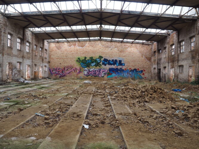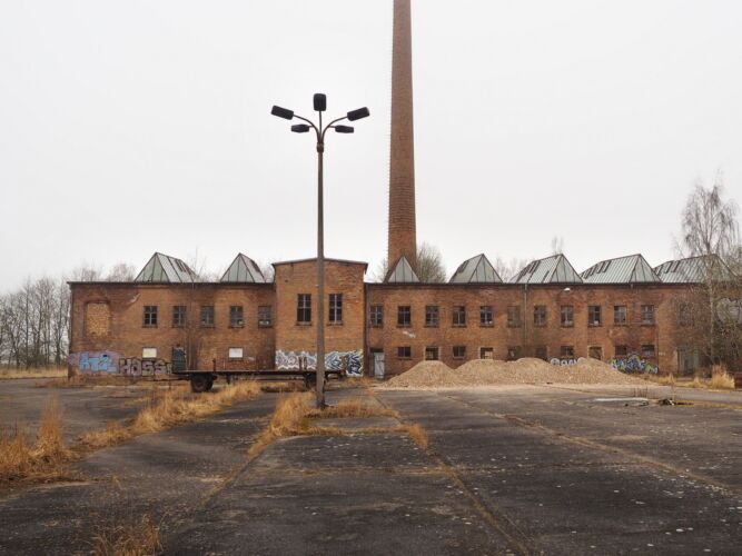 Zum Ziegelwerk habe ich wenige Informationen gefunden… Die fürstliche Ziegelei wurde zu DDR Zeiten in VEB Ziegelwerk Ketelshagen/Rügen umbenannt. Die hellen Backsteine, die typisch für die Brennerei waren, kann man selbst heute noch auf kleinen Häufchen in den Hallen bestaunen. Versorgt wurde die Ziegelei über eine ca. 1km lange Feldbahn in Spurbreite 600mm. Wer aufmerksam ist, findet die Gleise noch auf der Straße östlich des Geländes und in der Halle.