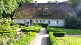 Das Wetter war traumhaft. Wir fuhren extra etwas früher zu Hause los, um noch einen kleinen Spaziergang durch den Park zu machen. Neben den Hirschen bewunderten wir die vielen alten Bäume und Villen. Aber auch ein Geocache durfte natürlich nicht fehlen. Dir Runde passte perfekt. Gegen 19 Uhr kamen wir am Witthüs an, welches tagsüber als Café die Gäste verwöhnt und abends Sterneküche anbietet.